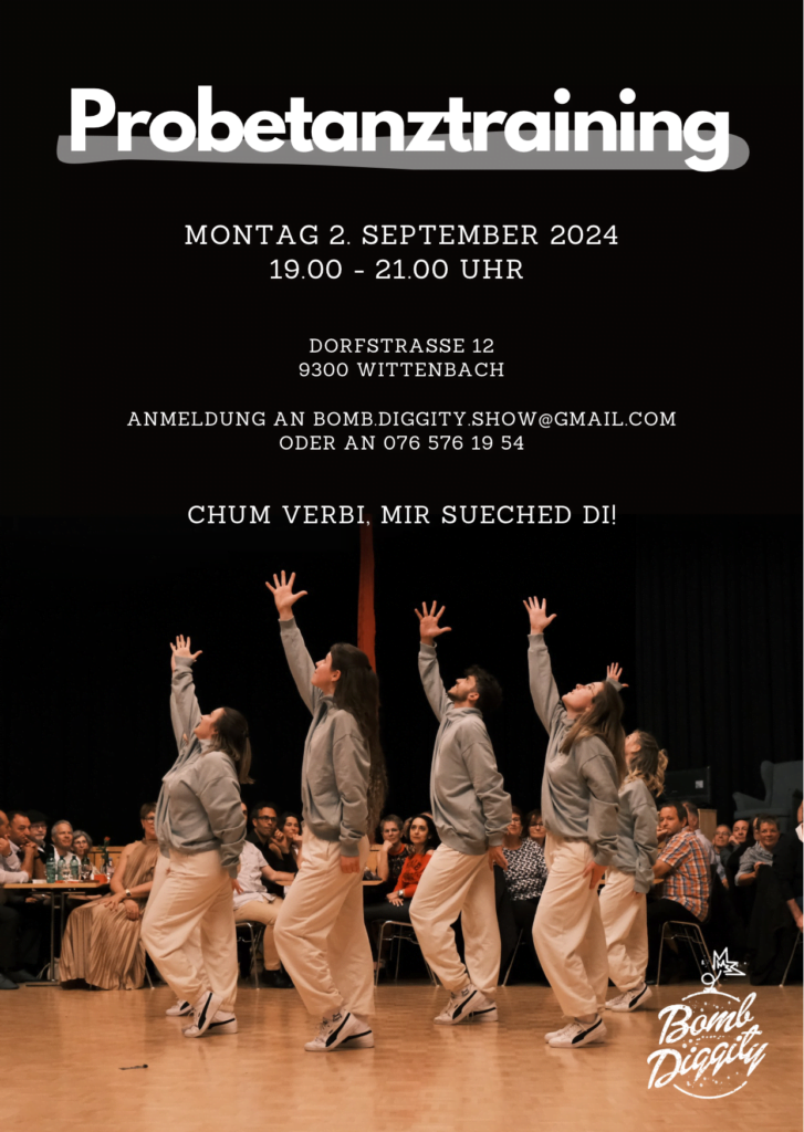 Der Steinacher Verein Bomb Diggity veranstaltet am 2. September 2024 ein Probetanztraining. Komm vorbei, lerne uns kennen und tanz mit uns. Möchtest du vorgängig mehr über unseren Verein erfahren oder willst du dich für das Probetraining anmelden, dann schreibe uns an bomb.diggity.show@gmail.com oder rufe uns unter 076 576 19 54 an. 🙂 Wir freuen uns auf dich!