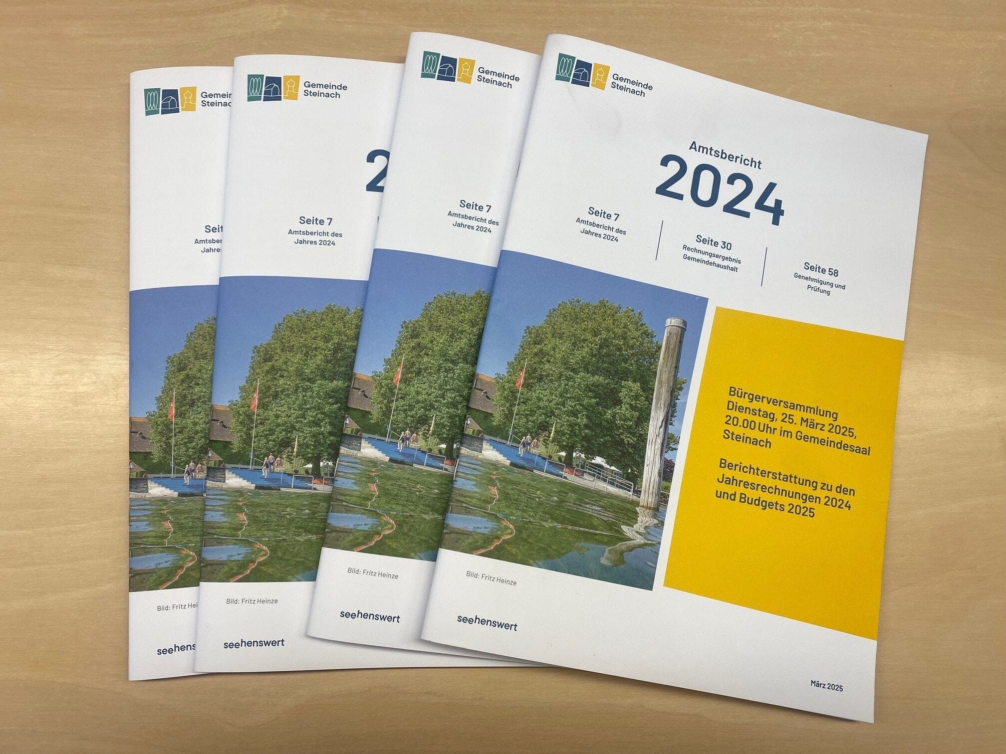 Der Amtsbericht 2024 wurde am Freitag 07. März 2025 in alle Steinacher Haushalte zugestellt. Zusätzliche Exemplare können bei der Gemeindeverwaltung angefordert werden: T 071 447 23 60 oder kanzlei@steinach.ch.