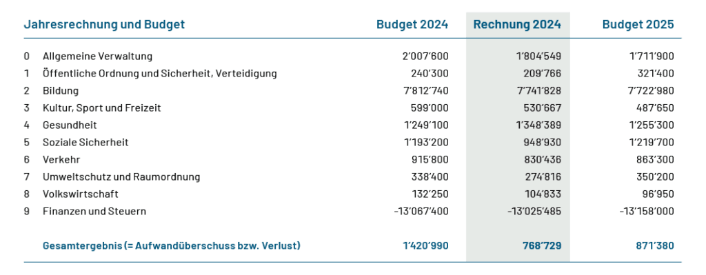 Die Erfolgsrechnung 2024 des Gemeindehaushaltes schliesst mit einem Aufwandüberschuss von knapp CHF 770’000 ab. Das Budget rechnete noch mit einem Defizit von CHF 1’420’990, das dank zahlreicher Minderausgaben nicht in dieser Höhe eintraf. Der Gemeinderat hat die Gründe für die Besserstellung sorgfältig analysiert und festgestellt, dass über die ganze Rechnung verteilt bestimmte Umstände zum besseren Ergebnis führten. Allerdings waren auch markante Mehrausgaben wie z.B. CHF 150’000 für zusätzliche Fälle der Pflegefinanzierung zu verzeichnen.