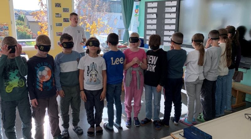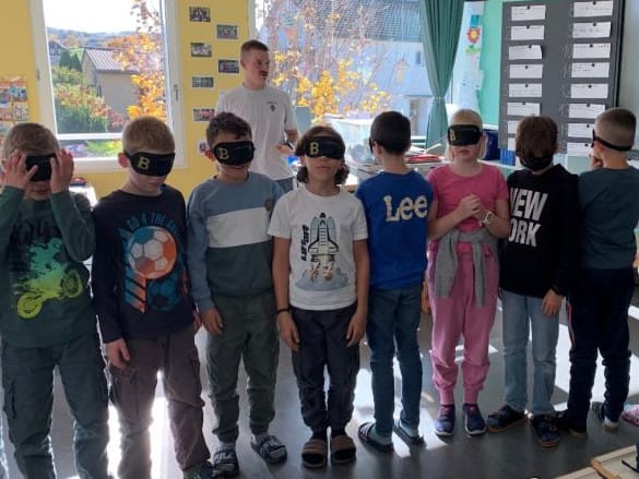 Besonders eindrücklich war eine Übung, bei der die Schülerinnen und Schüler eine Blindenbrille tragen mussten, während sie sich der Grösse nach oder in alphabetischer Reihenfolge aufstellen mussten. Dabei wurde schnell klar: Nur durch Vertrauen, Rücksichtnahme und klare Absprachen kann man gemeinsam ans Ziel kommen. Die Übung machte für alle spürbar, wie wichtig Zusammenarbeit, Kommunikation und gegenseitige Unterstützung für ein starkes Gemeinschaftsgefühl sind.
