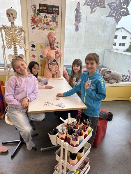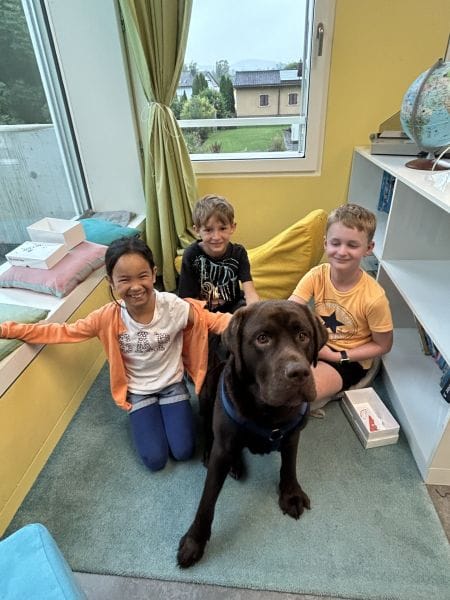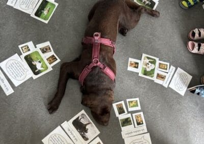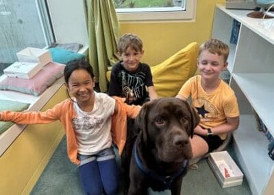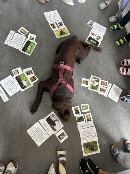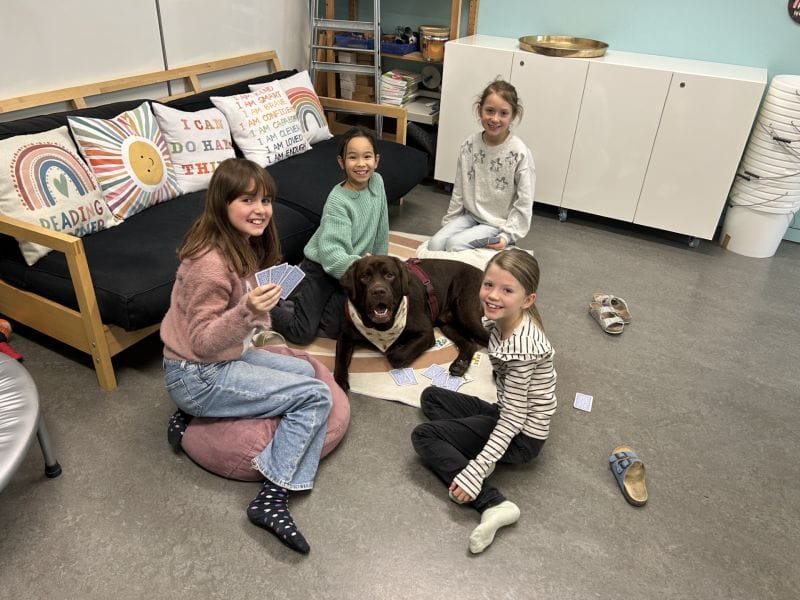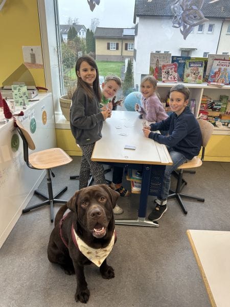 Spielerisch lernen die Kinder den Umgang mit Hunden kennen. Beim gemeinsamen Spielen und Beobachten mit Schulhund Dobby werden Vertrauen, Rücksichtnahme und Verantwortungsbewusstsein gefördert.